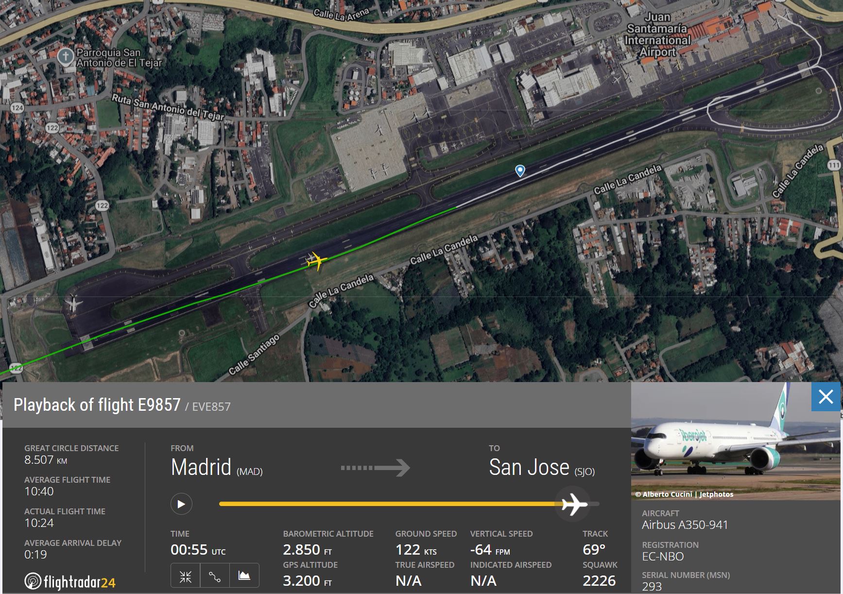 2026年2月21日,Iberojet 航班 E9-857馬德里飛哥斯大黎加聖荷西,由空中巴士 A350-900(註冊編號 EC-NBO)執飛。航機於聖荷西 Juan Santamaría 國際機場跑道 07 落地後偏向右側並觸碰跑道邊燈,隨後修正回跑道中心線並自行滑行至機坪。