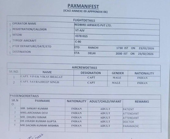 2026/02/23,Redbird Airways Pvt Ltd 一架 Beechcraft C90(VT-AJV)執行空中救護任務時,於 Jharkhand 邦 Chatra 區 Kasaria Panchayat 墜毀;機上共 7 人(含 2 名機組員)。該機自 Ranchi 起飛,與 Kolkata 建立聯絡後因天候請求偏航,19:34 IST 於 Varanasi 東南方約 100 海里處失去通聯與雷達聯絡,後續由搜救與調查單位介入。