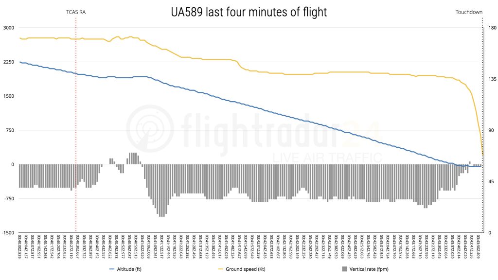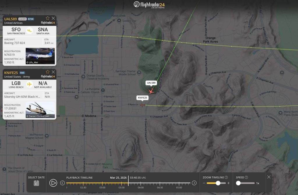 2026 年 3 月 24 日晚間約 20:40(當地時間),United Airlines航班 UA589(B737-800)自舊金山飛往加州 Santa Ana/John Wayne 機場(SNA),於最後進場階段遭一架軍用 UH-60 黑鷹直昇機穿越航道。Flightradar24 依航跡資料指出,雙方最近接時約為 525 英尺垂直間隔、約 1,422 英尺水平間隔,並觸發機組的 TCAS 解決指令(Resolution Advisory, RA);機組改平後持續進場,約數分鐘後安全落地。加州國民兵表示直昇機為例行訓練任務返場並與航管保持通聯;FAA 已啟動調查,將檢視當時分離方式是否符合近期針對直升機目視分離之限制措施。